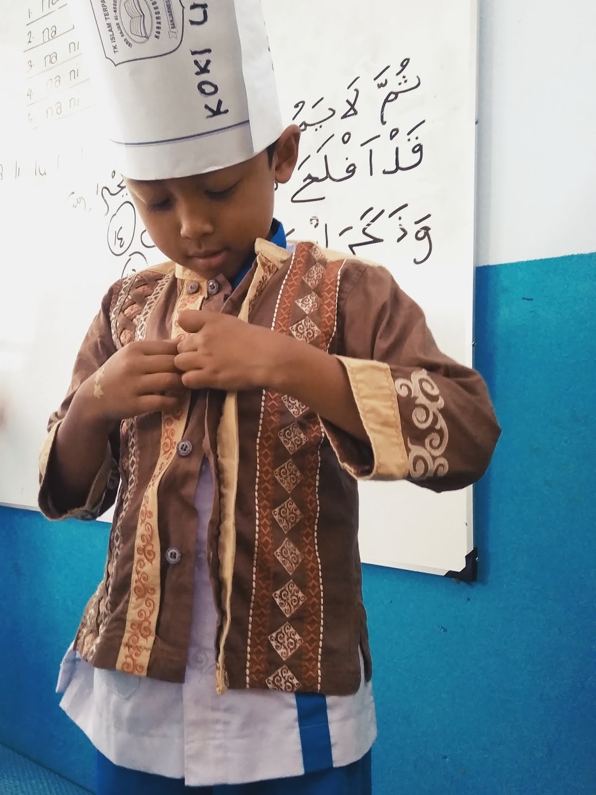 “Coba mas Abi dihitung ada berapa kancing yang terpasang?”
