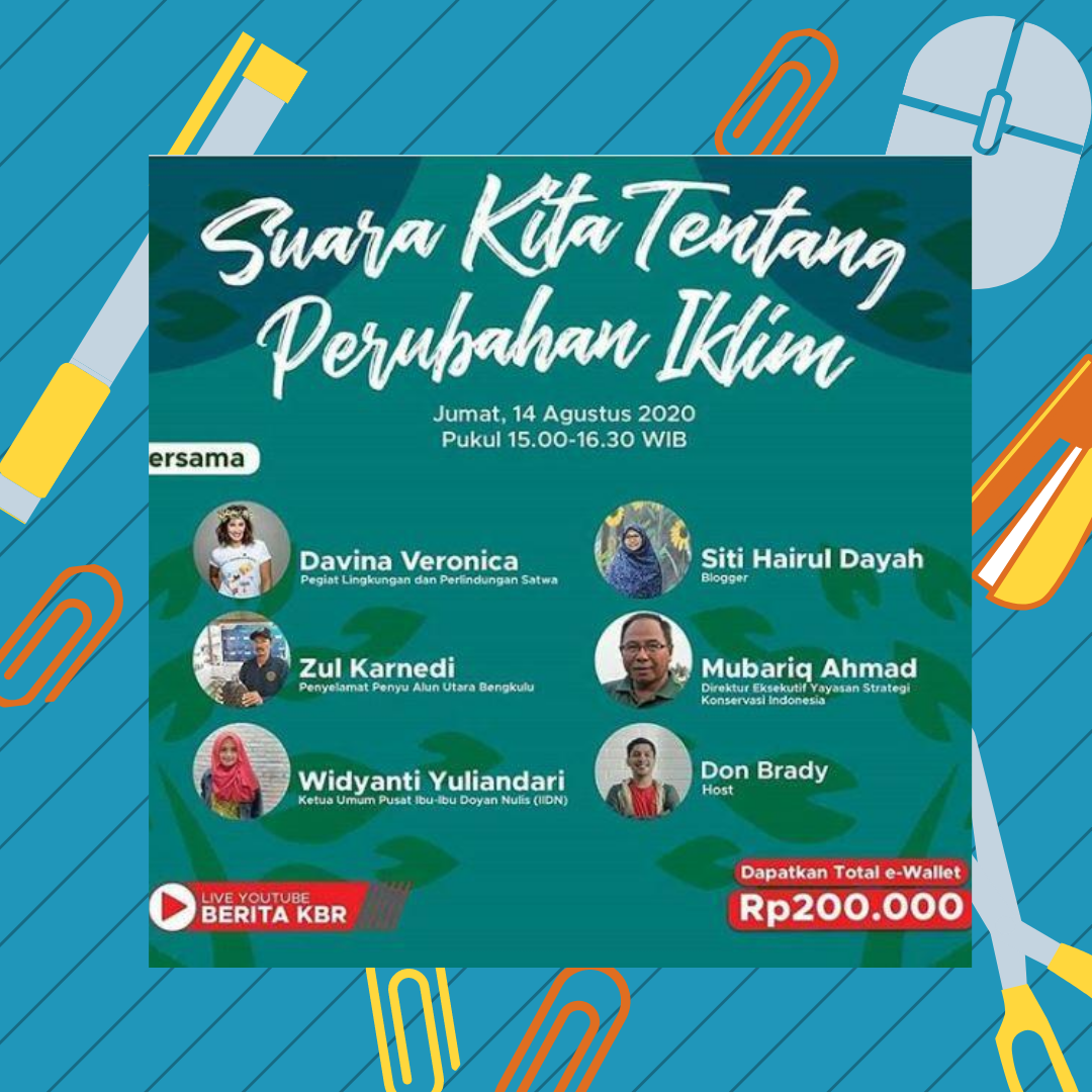 Nah acara yang aku ikuti berjudul “Suara Kita Untuk Perubahan Iklim.” Acara ini diadakan oleh Kantor Berita Radio. Acara webinar ini menghadirkan narasumber yang keren yang menceritakan terkait upaya mereka dalam mencegah perubahan iklim.